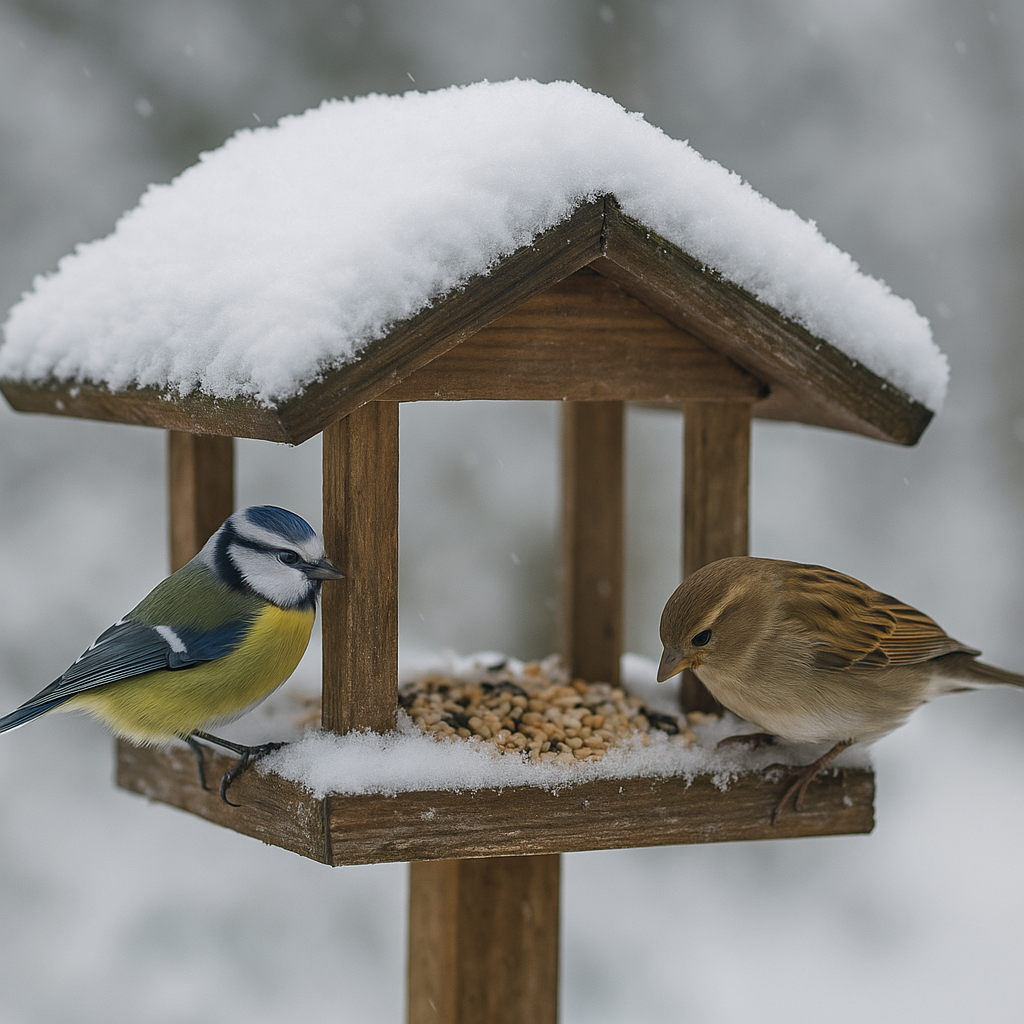 Et foderbræt med korn og frø hjælper havens fugle gennem vinteren.