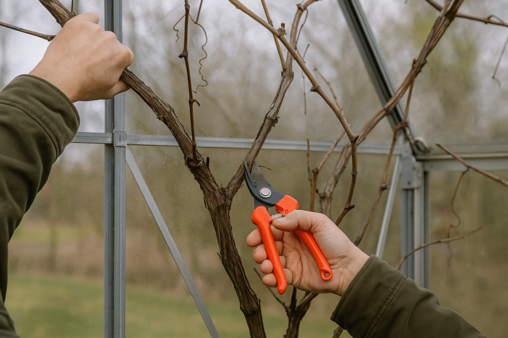 - Beskær vinplanten i drivhuset, inden saftstigningen starter.
