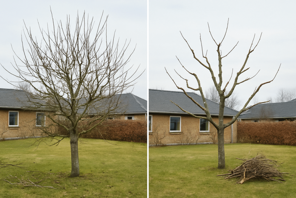 Vinterbeskæring foretages i perioden januar til marts, når træet er i hvile. Undgå at beskære i hård frost, da det kan skade grenene og forsinke heling.