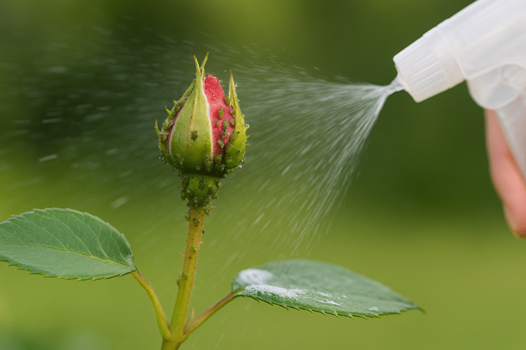 - Sæbevand: En mild opløsning af brun sæbe og vand kan sprøjtes på angrebne skud.