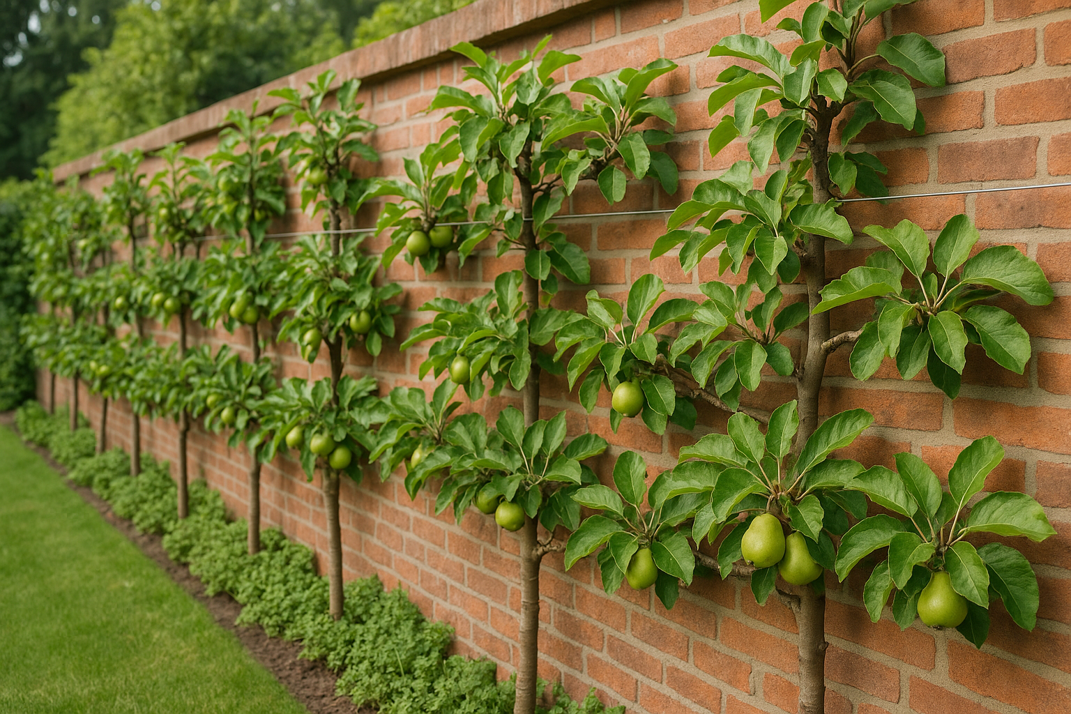 ½Espalier æbletræer er en smart løsning til små haver og køkkenhaver, hvor pladsen er begrænset. Træerne vokser fladt mod en væg eller opbinding, hvilket gør