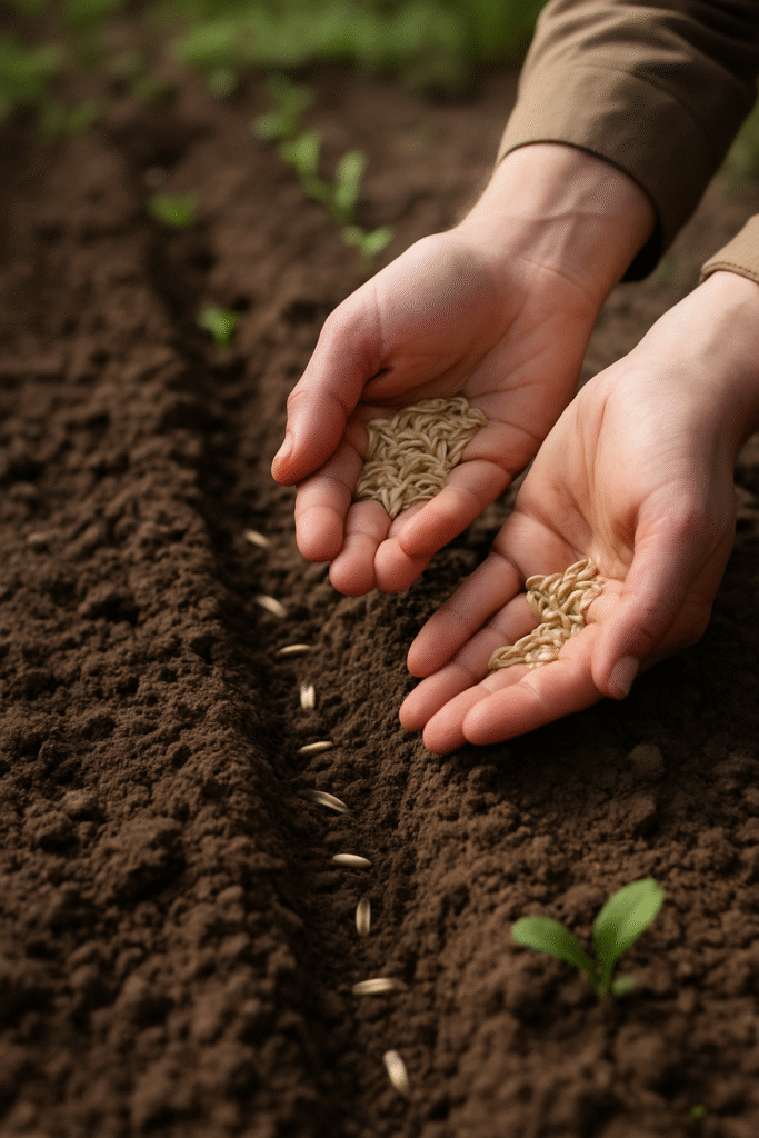- Forberedelse: Harves eller graves jævnt, så frøene får god jordkontakt.