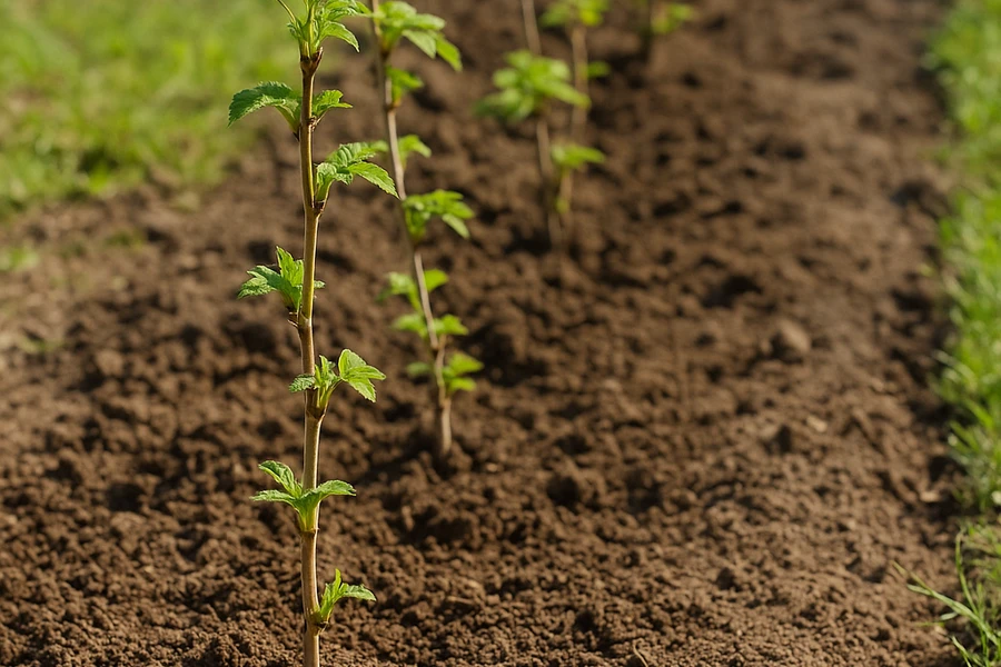 Hindbær plantes bedst i rækker med god afstand for lys og luft.