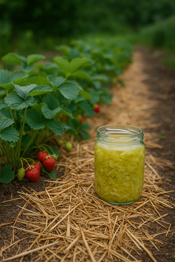 Et lag halm eller flis omkring planterne holder på fugten, hæmmer ukrudt og sikrer rene bær ved høst.