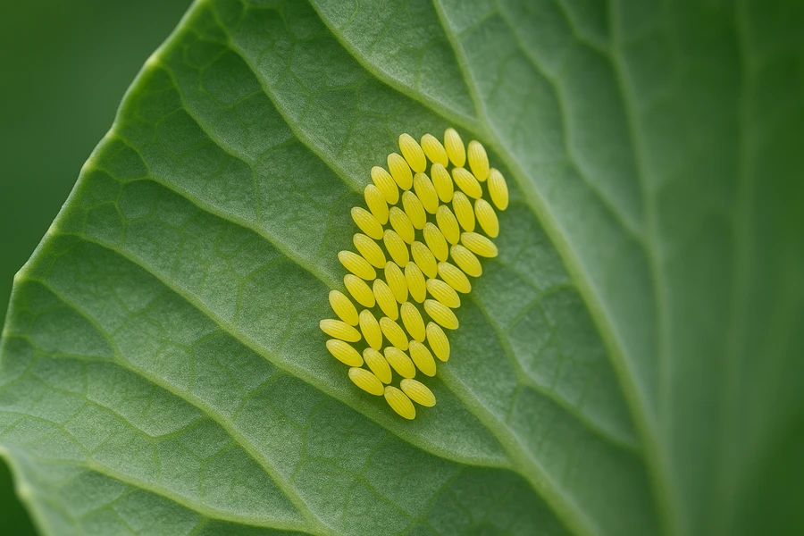 - Æg: gule, aflange æg i små klynger på undersiden af bladene.