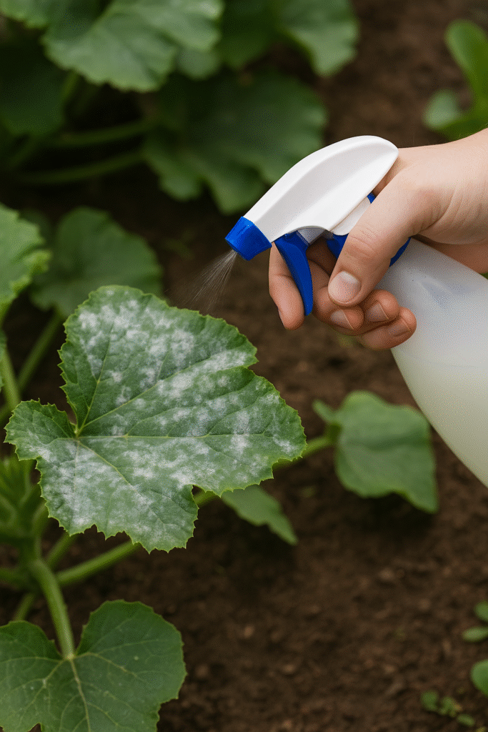 - Sprøjt med mælkeblanding (1 del mælk til 9 dele vand) på bladene.