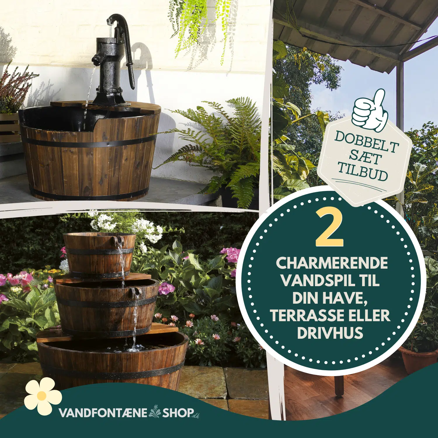 2 Tønde Vandspil / dobbelt tilbudspakke I denne tilbudspakke får du 2 forskellige vandspil designet som trætønder,- og hvor den ene også har en brøndpumpe som element. Oplagt til at skabe helhed og stemning på f.eks. din terrasse, drivhus – eller dit h