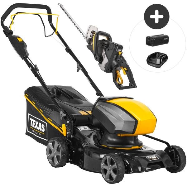I denne pakke får du den stærke plæneklipper på batteri Razor 4220TR-Li, der kommer med træk i baghjulene, så du blot skal gå bagved og styre den, når den effektivt klipper din græsplæne. Du får desuden også den kraftfulde hækkeklipper på batteri HTX4000,