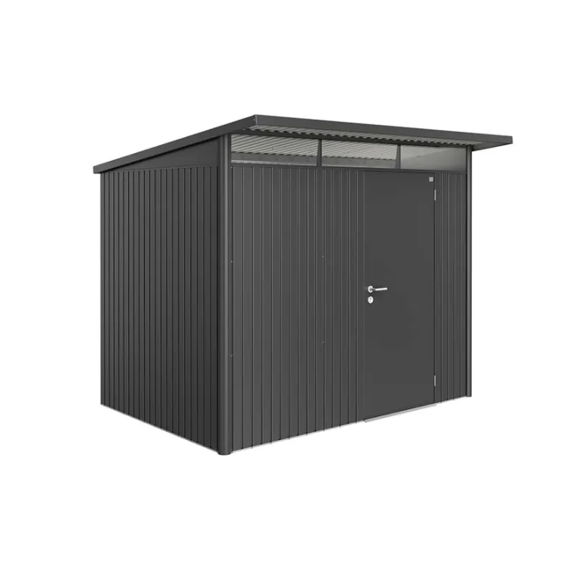 Biohort Avantgarde A4 – 17049 Sikkerhed: 3-vejs låsemekanisme med rustfrit stål dørhåndtag, standard cylinder of reserve nøgle. Moderne design til haveskuret. Optimal praktisk: installation af en dør i sidevæggen er mulig. Materiale i top kvalitet: varm