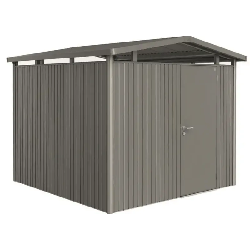 Panorama redskabsrum P4 m/enkelt dør – Kvartsgrå Metallic Skønheden ved naturligt lys Det omkransende ovenlysvindue, der er fremstillet af akrylglas, giver vores nye redskabsskur Panorama et lyst udseende og tillader denne model, med sit moderne gavltag,