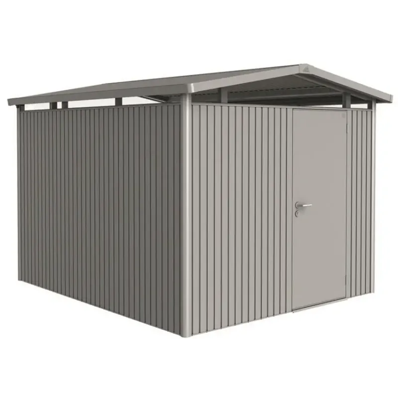 Panorama redskabsrum P5 m/enkelt dør – Sølv Metallic Skønheden ved naturligt lys Det omkransende ovenlysvindue, der er fremstillet af akrylglas, giver vores nye redskabsskur Panorama et lyst udseende og tillader denne model, med sit moderne gavltag, at p