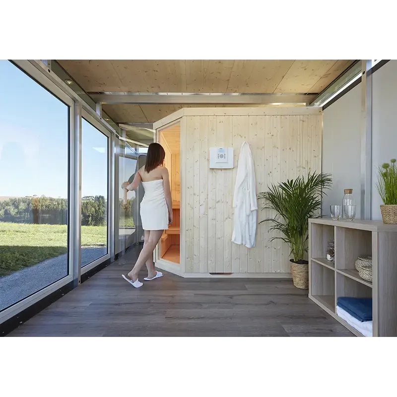 Biohort Sauna Modul Dør Højre – 50250 Få nemt din egen hjemme-sauna med dette komplette sauna modul fra Biohort. Sauna-modulet leveres i en 5-hjørnet version og har et areal på 200 x 200 cm, hvilket giver god plads til, at to personer kan nyde saunaen
