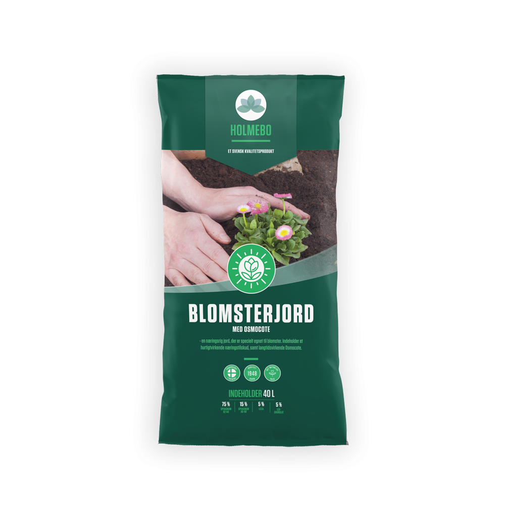 God blomsterjord fra Holmebo i 40 liters poser. Svensk produkt fra højmose, af absolut topkvalitet. Holmebo Blomsterjord er en næringsrig all-round jord, der er specielt egnet til dyrkning af planter og blomster Blomsterjorden indeholder både et hurtigtvi