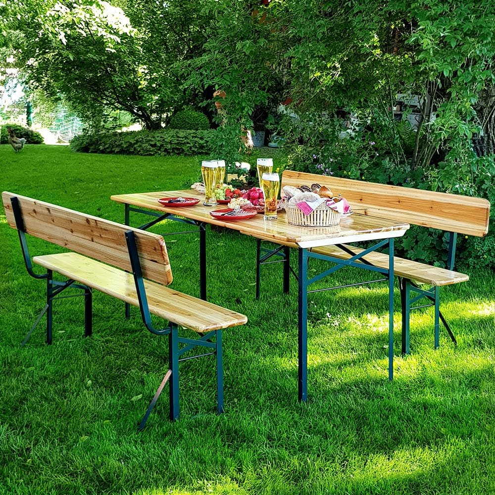 Bord- og bænkesæt til haven Robust og slidstærkt 3-delt bord- og bænkesæt med ekstra bredde (70 cm bordbredde) og komfortable ryglæn. Hele sættet kan klappes sammen så det let kan sættes i skuret. Hængslerne er lette at åbne og lukke, og både bord- og bæn