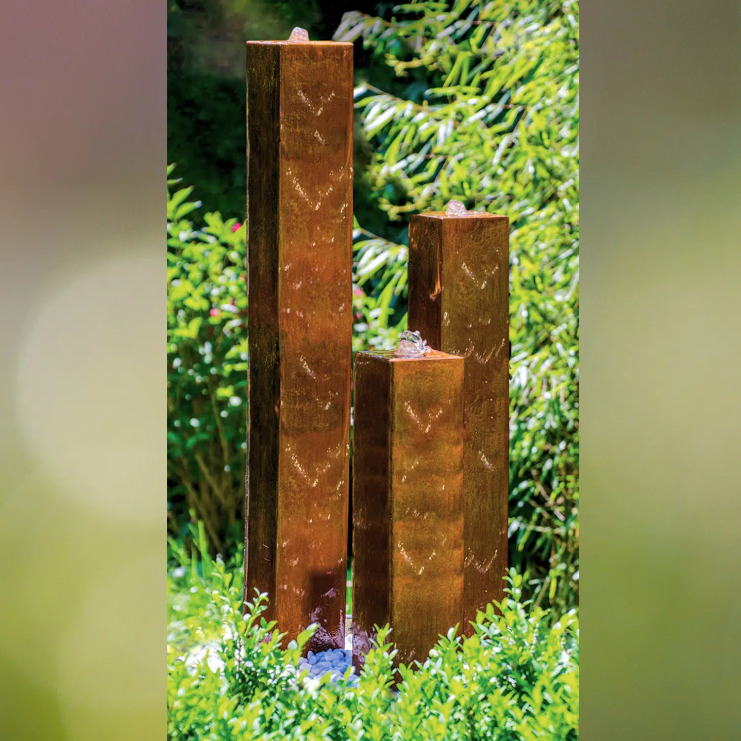 • Springvand i form af en 3-søjlet vandfontæne i høj kvalitet lavet af det eftertragtede corten stål (Mat rust look) som er blevet mere og mere populært de seneste 10 år. Blandt andet ser man også plantekasser i samme stærke “rustne” materi
