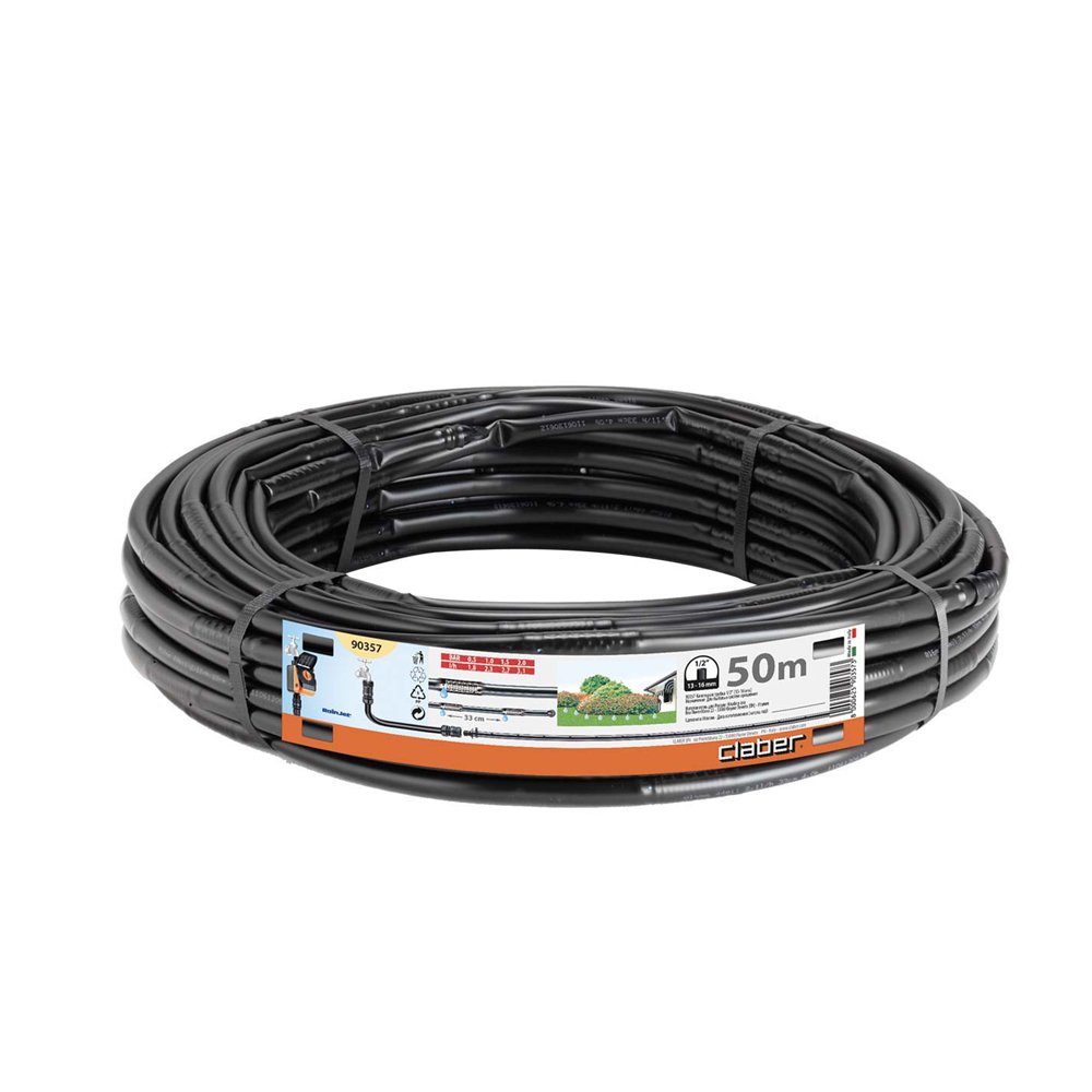 Claber Drypslange 50 meter er en effektiv og fleksibel 1/2″ (1316 mm) polyethylenslange, der sikrer jævn og vandbesparende vanding af hække, blomsterbede og køkkenhaver. Slangen har indbyggede labyrint-dryphoveder for hver 33 cm, som fordeler vandet præci
