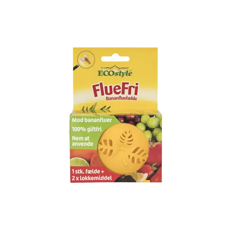 Ecostyle Fluefri – BananfluefældeFanger bananfluer, også kaldet frugtfluer eller eddikefluer. 100% giftfri. Lokkemiddel tiltrækker bananfluerne. Når bananfluerne er fløjet ned gennem fældens tragt, kan de ikke finde ud igen. Nem og sikker at anvende. Pakk