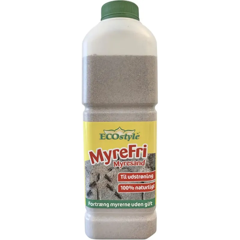 Ecostyle Myrefri Myresand – 1 Liter – Klar Til Brug ⢠100% naturligt og giftfri. ⢠Lukker myreboet til, så myrerne ikke kan bo i myreboet og flytter væk. ⢠Til ude og inde. ⢠Dansk produceret og baseret på danske råstoffer (moler og kvartssand fr