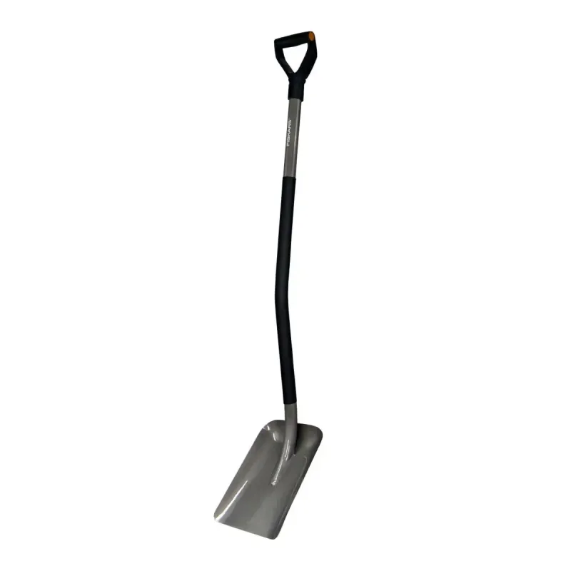 Fiskars Skovl Ergonomic Grå Ergonomisk skovl med forstærket dråbeformet stålskaft, D-håndtag og blad i hærdet stål er beregnet til flytning af jord, sand, grus samt til betonarbejde.