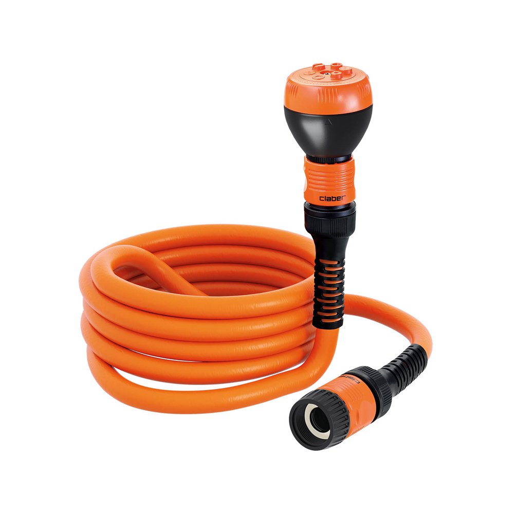 Udtrækkelig slange med tilbehør. Når vandet løber igennem slangen, udvider den sig til op til dobbelt længde ved det ideelle tryk på 3 bar – maks. længde 15 m. Efter brug skrumper den af sig selv tilbage til sin oprindelige størrelse. Superlet, den er ide