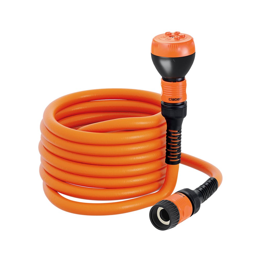 Udtrækkelig slange med tilbehør. Når vandet løber igennem slangen, udvider den sig til op til dobbelt længde ved det ideelle tryk på 3 bar – maks. længde 15 m. Efter brug skrumper den af sig selv tilbage til sin oprindelige størrelse. Superlet, den er ide