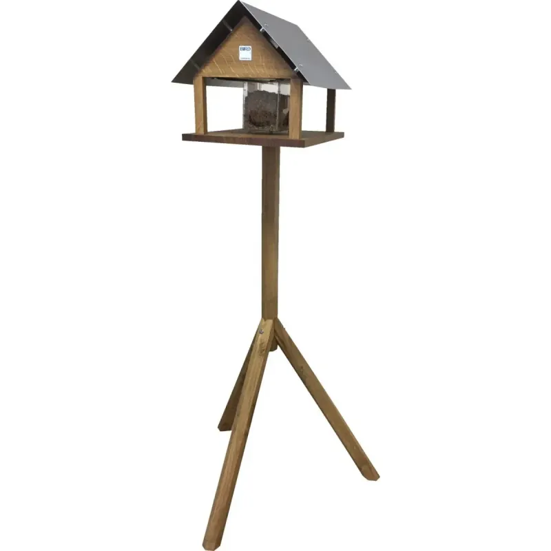 Fuglefoderhus foderhus Effel Flot fuglehus med stander i oliebehandlet eg med galvaniseret tag. Dette fuglehus har en praktisk fodersilo i klar akrylplast til dosering af foder, som er monteret i foderhuset. L37xB29xH125 cm