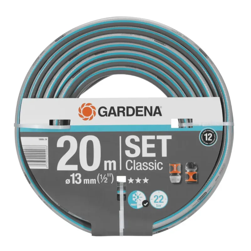 Gardena Classic Slange 1/2″ 20m – 18006-24 GARDENA CLASSIC SLANGE 20 meter trykfast og UV-resistent slange. 1/2″ slange. Tryk 22 bar. Indeholder ingen skadelige blødgøringsmidler eller tungmetaller. Med 2 standardslangekoblinger.