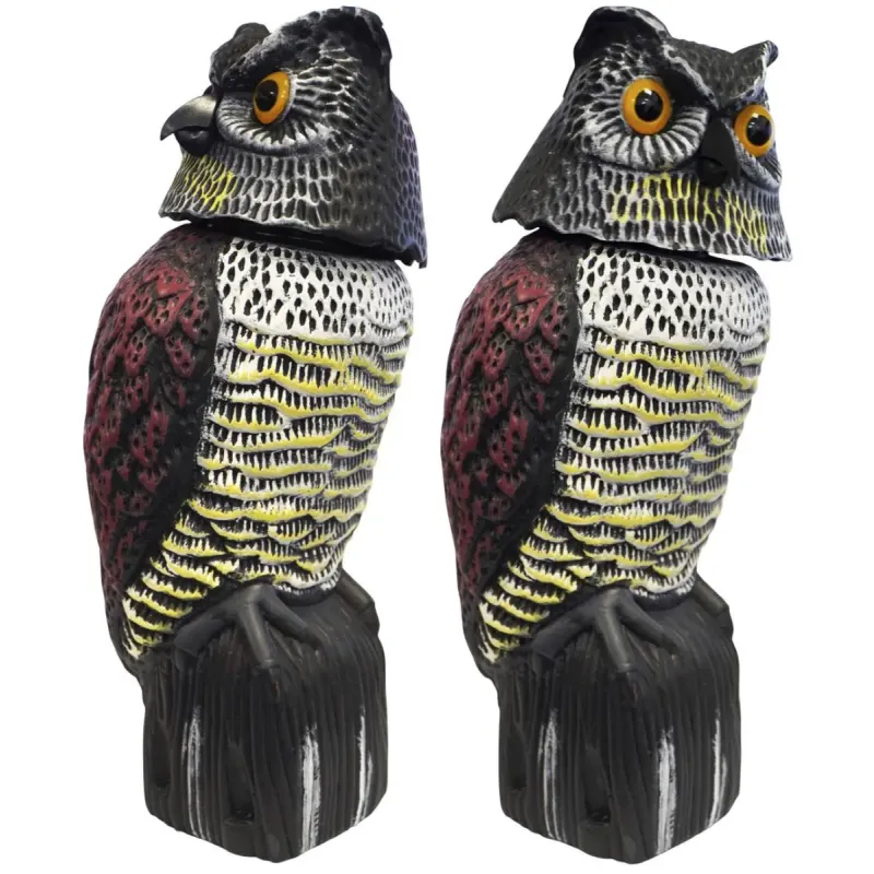 Green-it fugleskræmmer ugle med 360° roterende hovedFugleskræmsel med 360° roterende hoved, udformet som en ugle, som beskytter din have, taget, jordbærbedet, urtehaven, moreltræet og andre afgrøder mod skadedyr. Det roterende hoved gynger i vinden for