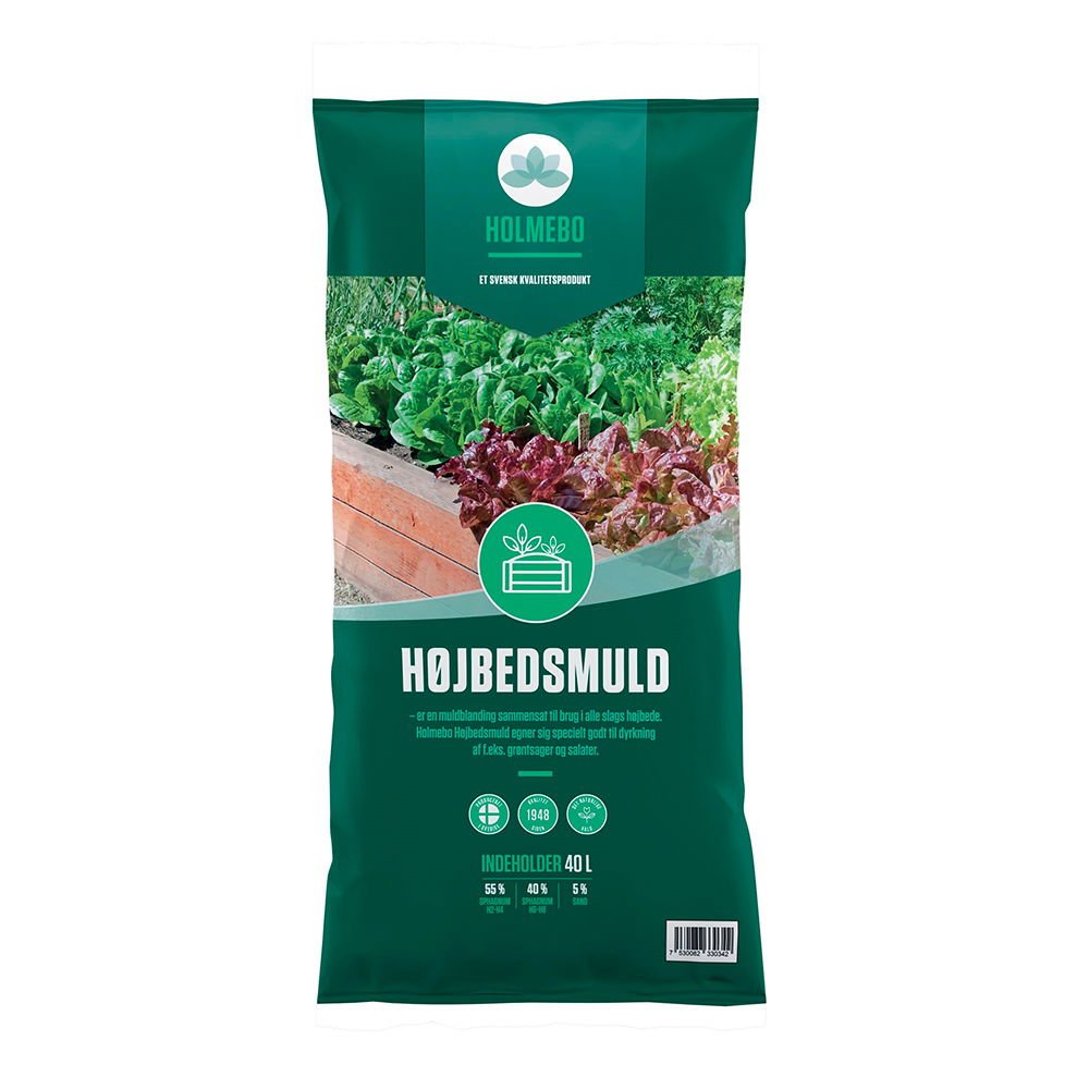 Holmebo Højbedsmuld er en næringsrig muld til dyrkning i højbedet. Velegnet til både grøntsager, krydderurter og blomster. Mulden har en rigtig god jordstruktur og en fantastisk evne til at optage vand, hvilket nedsætter vandingsbehovet og øger kvaliteten