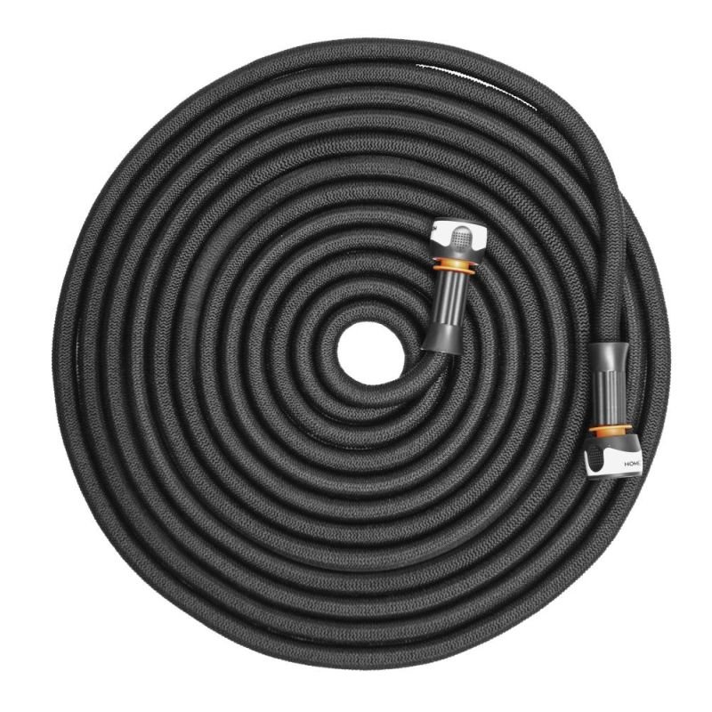 HOME It® universal flexvandslange med kobling 30 meter – 91302 Du behøver ikke særlige vandslangeholdere, fordi slangen trækker sig så meget sammen og derfor blot kan hænge, på et ophæng eller et langt søm. Du kan med fordel opbevare en fleksibel vand