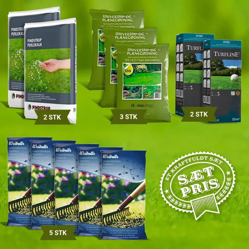 Homeshop Deluxe plænepakke 200m2 – Pakke 1 uden strøvogn Trænger din græsplæne til pleje og en opfriskning? Vi har gjort det nemmere for dig og sammensat et sæt af forskellige produkter, der dækker en græsplæne på ca. 200 m2. Dette sæt indeholder: â¢