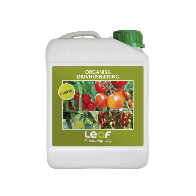 Homeshop Drivhusnæring Organisk 2500 Ml Leaf organisk flydende næring. Organisk næring til grønsager, krydderurter og frugter i drivhuse, samt højbede og krukker. Kan anvendes i økologisk landbrug. Anvend dunkens låg som målebæger og bland 20ml til 2 l v