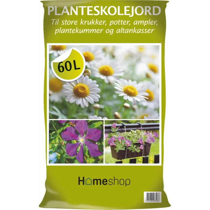 HOMESHOP PLANTESKOLEJORD – 60 LITER Optimale forhold til dine planter Giv dine planter de optimale forhold med Leaf planteskolejord. Ideelt til udendørs plantning i krukker, ampler, potter og altankasser. Jorden indeholder gødning til de første par uger.