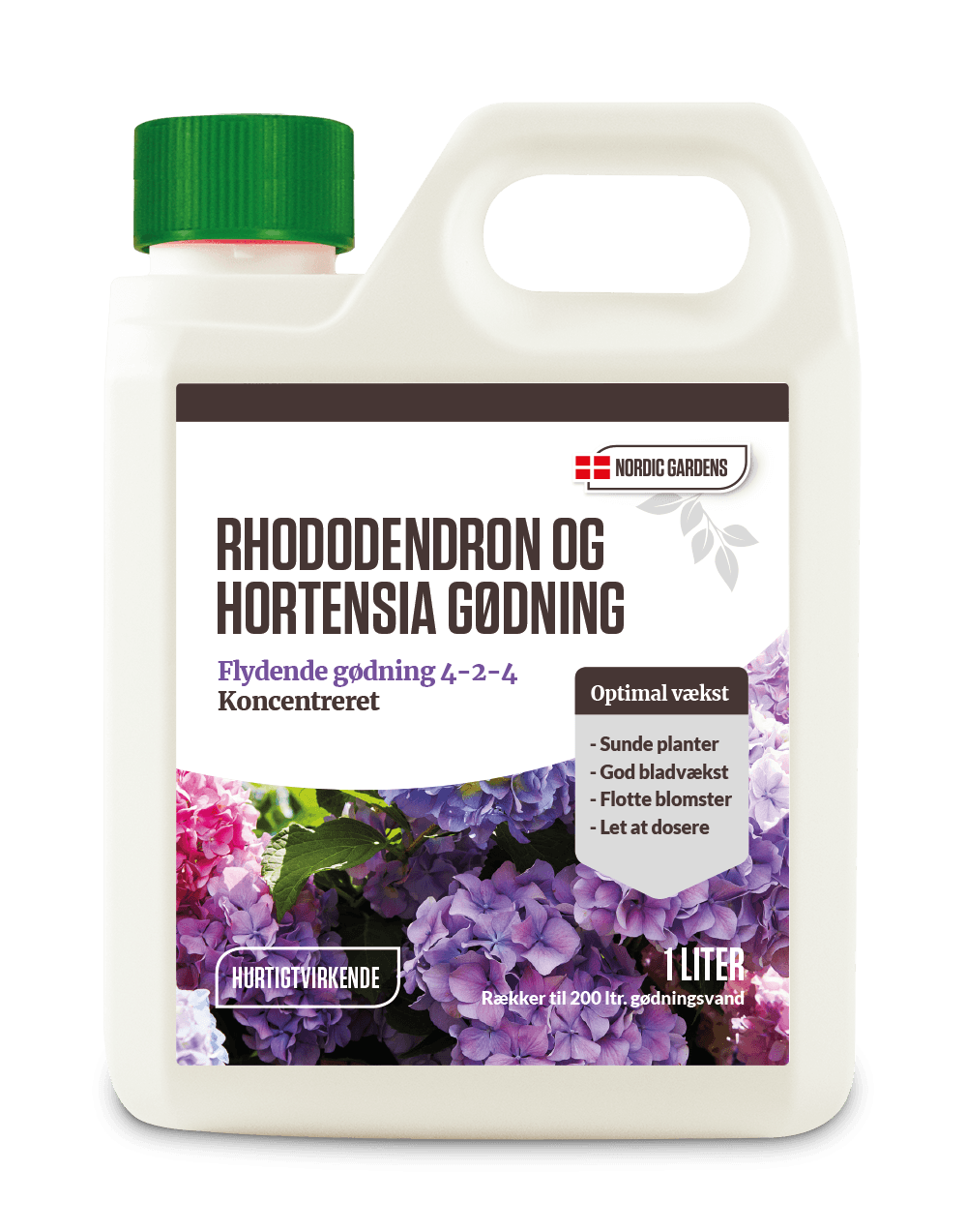 Rhododendron og Hortensia gødning 4-2-4 fra Nordic Gardens er en koncentreret gødning, der er velegnet til alle typer rhododendron og hortensia i både krukker og bede. Giver sunde planter, god bladvækst, flotte blomster og er let at dosere.Anvendelse: Rys