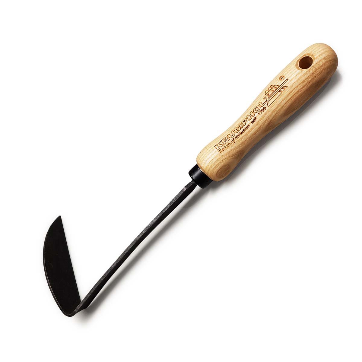 Krumpholz Japansk Seglhakke 1731 til venstrehåndede er et præcist og effektivt redskab til ukrudtsbekæmpelse og jordbearbejdning i grøntsags- og staudebede. Den håndsmedede og let buede klinge i hærdet kulstofstål gør det muligt at skære ukrudtsrødder af
