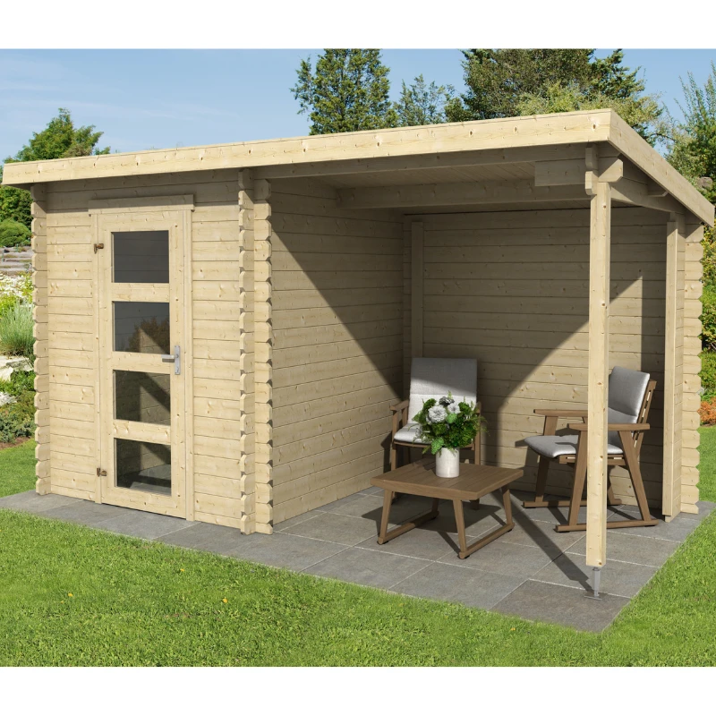 Et klassisk bjælkehus udført i fine materialer krydret med et lille fint udhæng. Det kan bruges som opbevaringsrum til diverse småting. Der er desuden rigtig god belysning indenfor, da vinduerne i døren lader lyset skinne igennem.