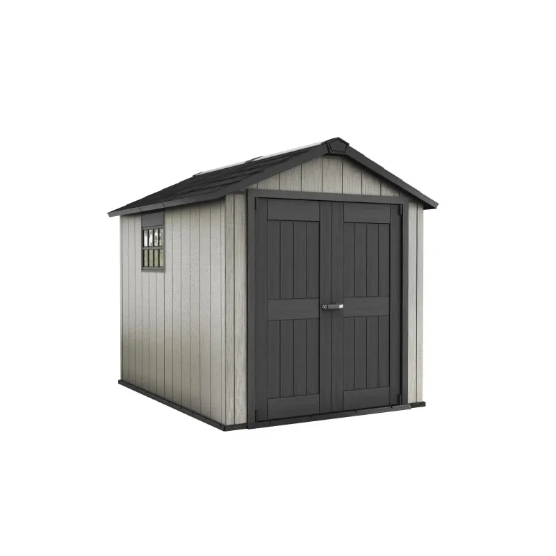 Keter Oakland 759 6,57m2 – 229x242x287 Oakland 759 er et rustikt, men elegant skur med en flot patineret træstruktur. Skuret har en loftshøjde, som er tilstrækkelig til at en voksen sagtens kan bevæge sig rundt derinde. Oakland 759 har brede dobbeltdøre,