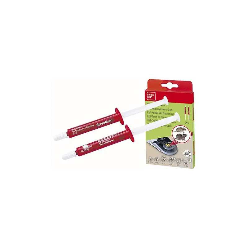 Lokkemiddel Mus Og Rotte 2×3 Gram – 228-559Lokkemiddel til mus- og rottefælder. Flydende SuperCat lokkemiddel til mus og rottefangst. Æske indeholder 2 sprøjter á 3 gram. Kan bruges til alle typer fælder. Indhold: Peanut butter.