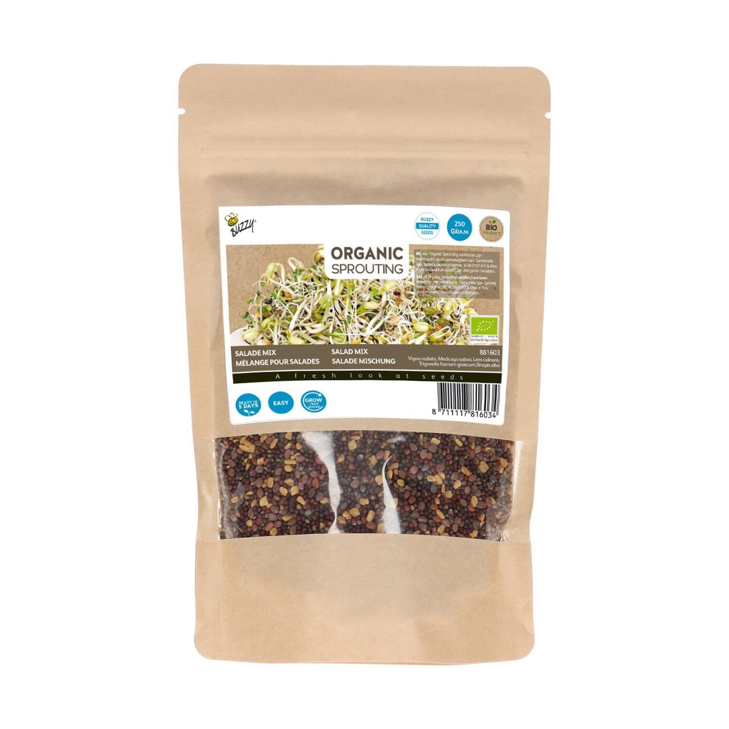 Det økologiske salatmix af spirer er let at dyrke året rundt i din vindueskarm. Ved hjælp af en spirekasse kan du fremdyrke de mest lækre spirer – direkte i din vindueskarm.Dette mix er en blanding af mungbønner, lucerne, linser, bukkehorn og gul sennep –