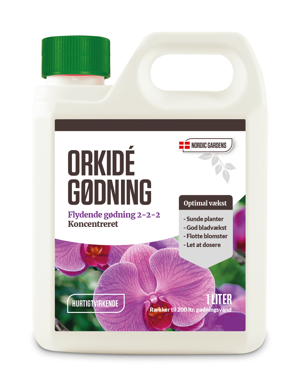 Flydende Orkidégødning 2-2-2 fra Nordic Gardens er en koncentreret gødning, der er velegnet til alle typer orkidéer både ude- og indendørs. Giver sunde planter, god bladvækst og flotte blomster. Let at dosere.Anvendelse: Rystes godt før brug. Blandes i va