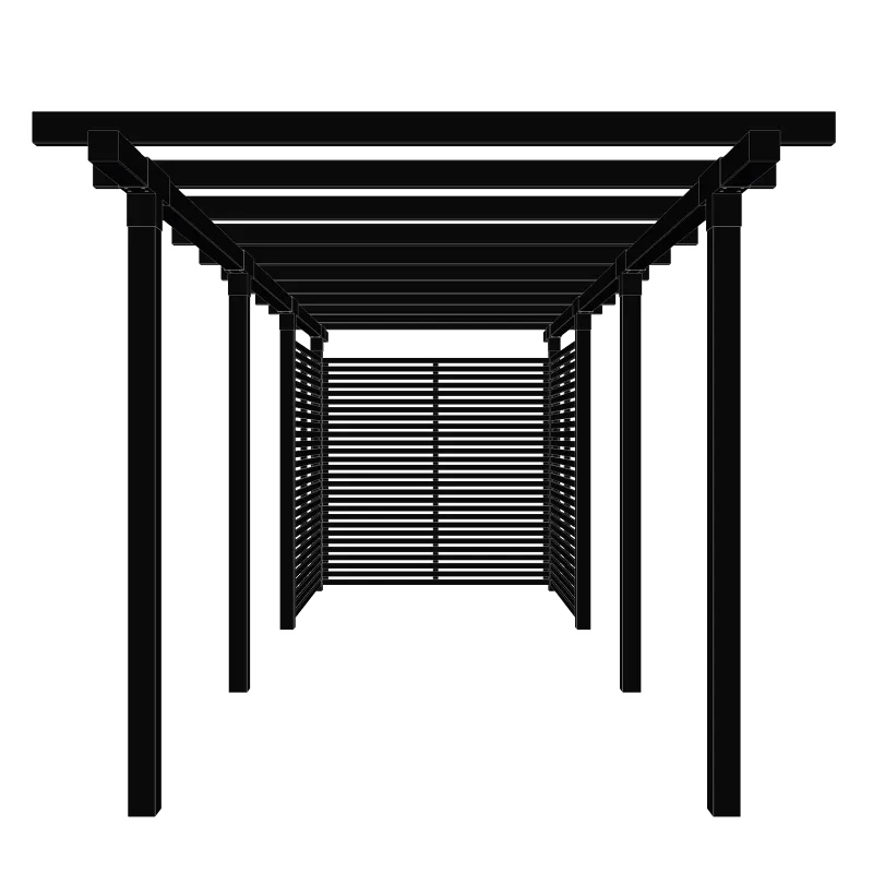 Plus Dobbelt pergola 3 moduler inkl. Tokyo hegn – 664x238x218 – 179099-15 Specifikationer: Bredde: 238 cm Højde: 217 cm Længde: 664 cm Farve: Sort RAL 9005 Materiale: Fyr Overflade: Trykimprægneret NTR Kl. A og grundmalet Design: PLUS A/S Vægt: 234,72 Kg