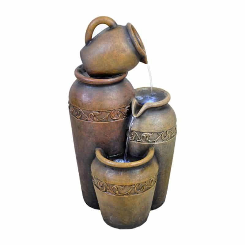 Kande og krukke springvand Smukt vandspil med urne-lignende krukker i top-, mellem- og bundniveau. Vandet løber via fontænens pumpe fra den øverste urne ned langs den midterste og sluttelig ned i den faststående på jorden. Bemærk: Denne vandfontæne ha