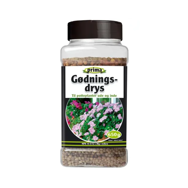 Prima Gødningsdrys 650g Npk 15-3-12+1mg Drysses på jorden eller under plantens rod ved omplantning. Afgiver løbende den nødvendige næring. Velegnet til de fleste grønne og blomstrende planter i krukker, hus og have.