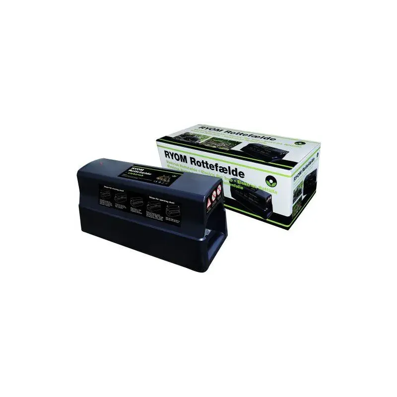 Rottefælde Elektr.excl Bat. (4xd) – 228-580Rottefælde elektrisk. Sort plastkabinet med 2 metalplader indvendig i bunden. Afgiver lys og lydsignal ved fangst. Bruger 4 x D batter (medfølger ikke). Måler 28 x 13 x 12 cm. Til både indendørs og udendørs brug.