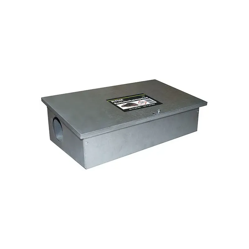Rottegiftkasse Galv. M/skrue – 228-690Rottegiftkasse af galvaniseret plade med 2 indgange. Med gulvbelægning og separat giftafdeling med 2 stifter til giftblokke. Skydelåget er sikret med skrue der låser låget fast. Længde 350 mm.