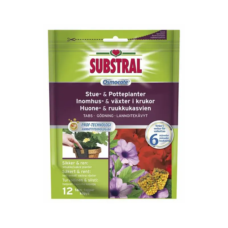 Substral Osmocote Tabs 0,9 Kg Substral Osmocote tabs er til stue- og potteplanter. Tabletterne placeres under plantens rødder eller trykkes ned i jorden tæt ved planten, og afgiver derefter næring til planten de efterfølgende 6 måneder. Antal i pakke