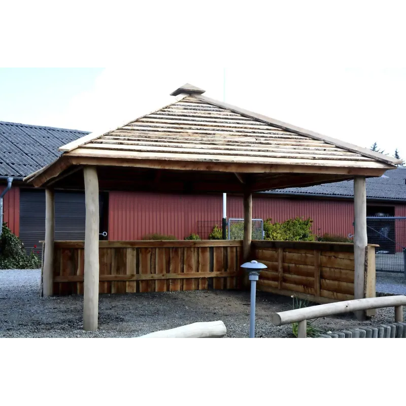 Tiset Bålhytte 4 X 4 Mtr. Lærk Leveres Usamlet Bålhytte i kraftig lærk Udvendig mål inkl. udhæng 4,5 x 4,5 m./ Indvendig 4 X 4 m. Dansk produceret. Stolperne er i Robinie træ der har en lang levetid og som er særdeles velegnet til jord kontakt. Der med