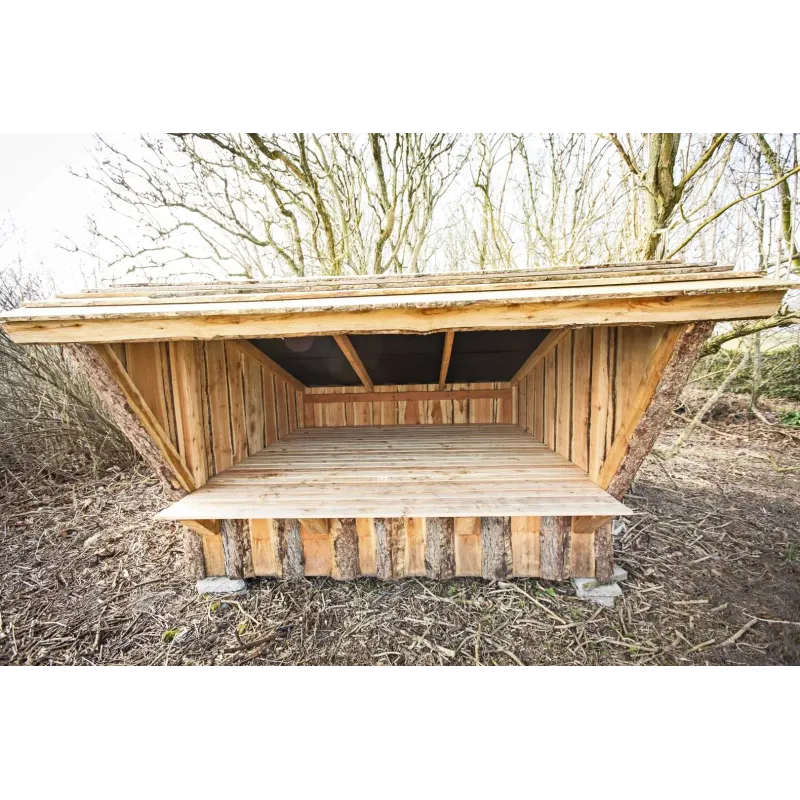 Tiset Shelter Gram 360 * 210 Usamlet Gram Shelter stor model Usamlet Udvendig mål inkl. udhæng 3 x 4,2 m. / indvendig 2,1 x 3,7 m. Shelter produceret i dansk lærketræ. Bemærk, shelteret er vist med bænk og madrasser, dette medfølger ikke. Indvendig