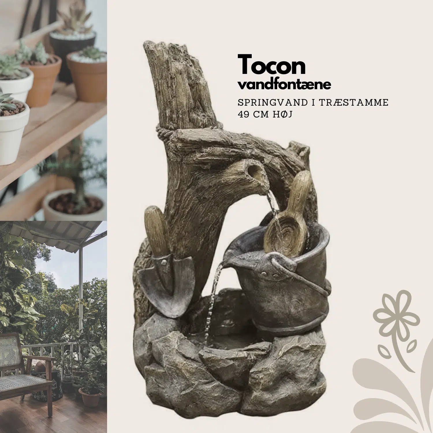 Springvand med spand og skovl Charmerende vandfontæne med træstub dekoration. Vandet risler ned igennem hele fontænen. En dekorativ vandfontæne med spand, skovl og ske i én fontæne som skaber hygge og stemning. Der er tænkt på den mindste detalje i produk