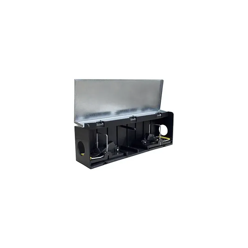 Tunnelbox Mus Med 2 Smækfælder – 228-697Driftsikker prof. fangstkasse med 2 integrerede smækfælder og spyd til montering af lokkemiddel. Kabinet i slagfast plast med galv. låg. Simpel og praktisk løsning til bekæmpelse af mus uden brug af gift. Lev